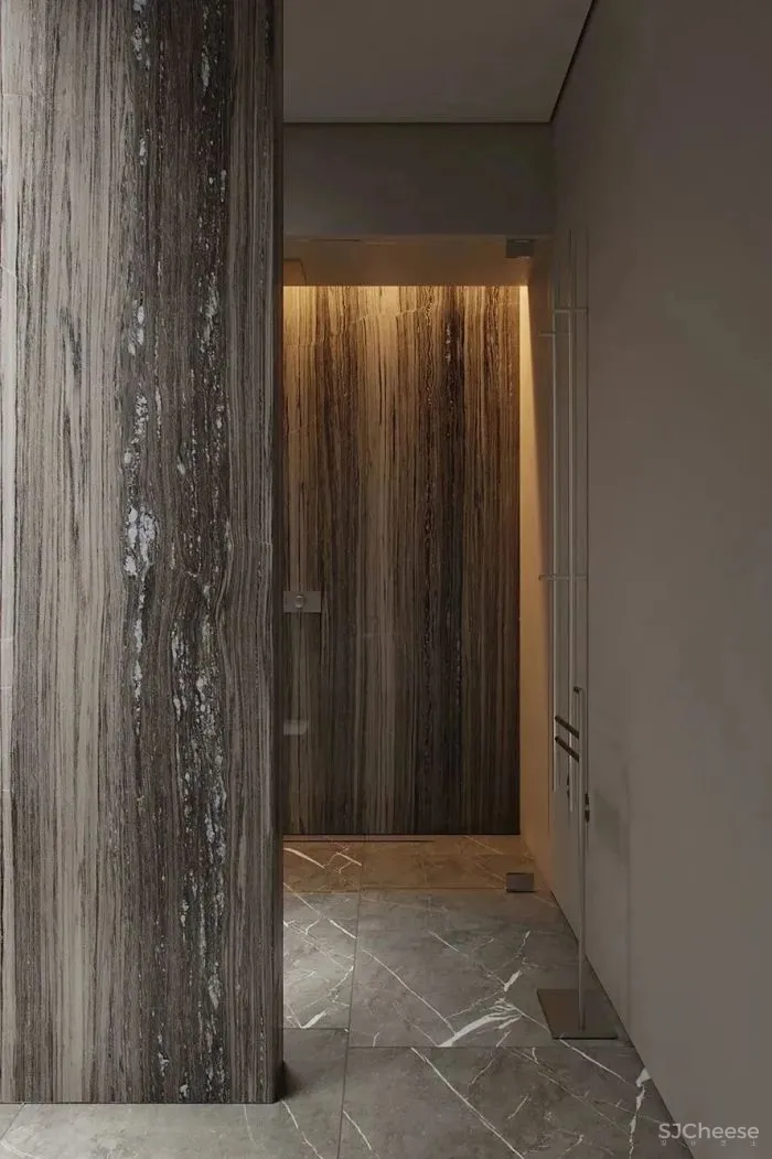 这间卫生间相比之下更加大胆夸张,主要来源于强烈的纹理对比产生的视觉冲击,暖色的灯光让这里变得更有情调。