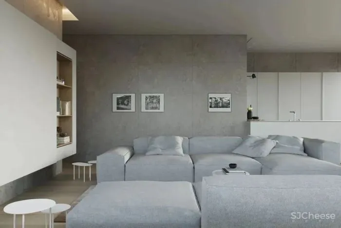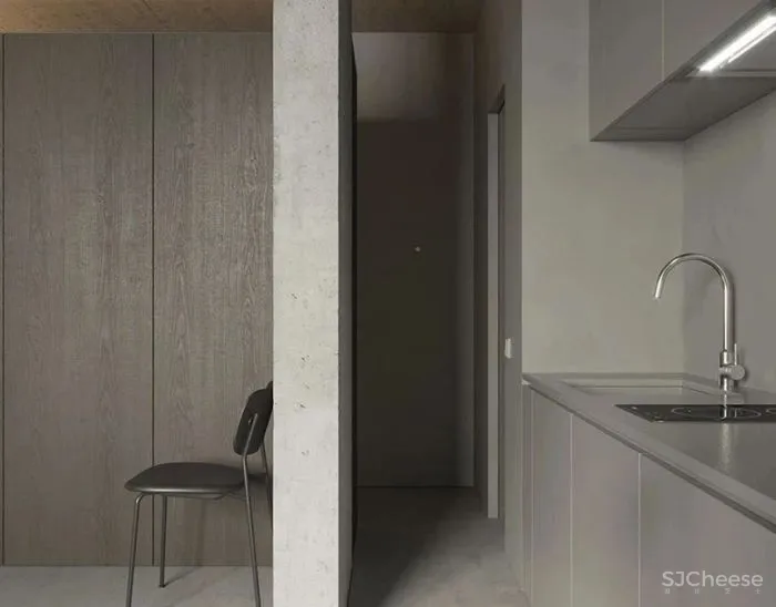 住宅的周围是一片松树林,这也为室内奠定了基础色调。极净的空间里达到完美的平衡状态,在元素的色彩、材质上也达到平衡,也是极度舒适的空间。沙发与厨房在表达纯粹的生活理念。灰色的墙面减轻混凝土的分量感。