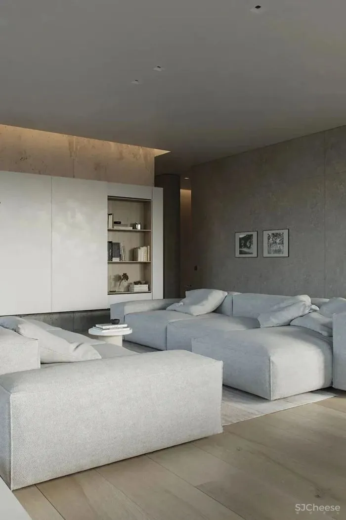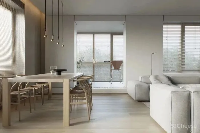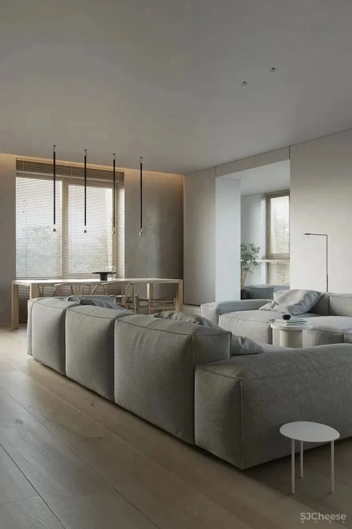 The gray sofa contrasts with the white wall facing directly, and the rounded sides weaken the sharpness of the rectangle. There is a dialogue between the log floor and the dining table, and there is a feeling of returning to the natural state.