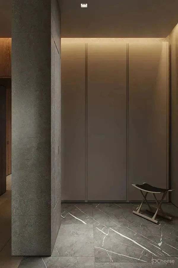 通向住宅内部的过道由一面混凝土墙面引领,没有过多的装饰搭配,通过墙面材质的纹理突出空间的细腻,空间结构的变化也让空间线条变得丰富。