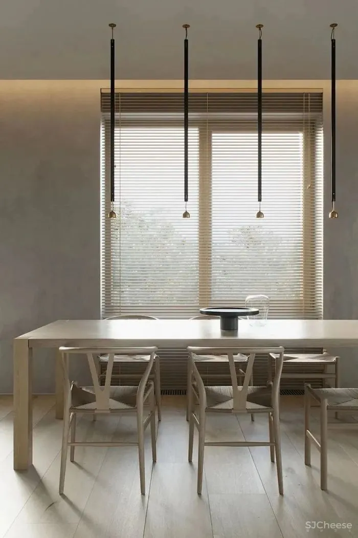 The four slender dining table chandeliers are quite artistic, and the small and exquisite shapes add a sense of detail to the room.
