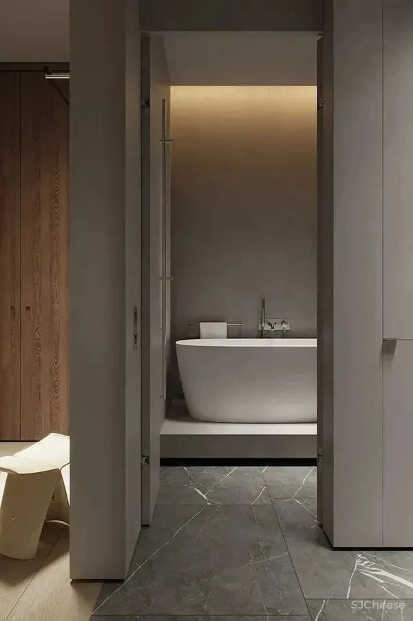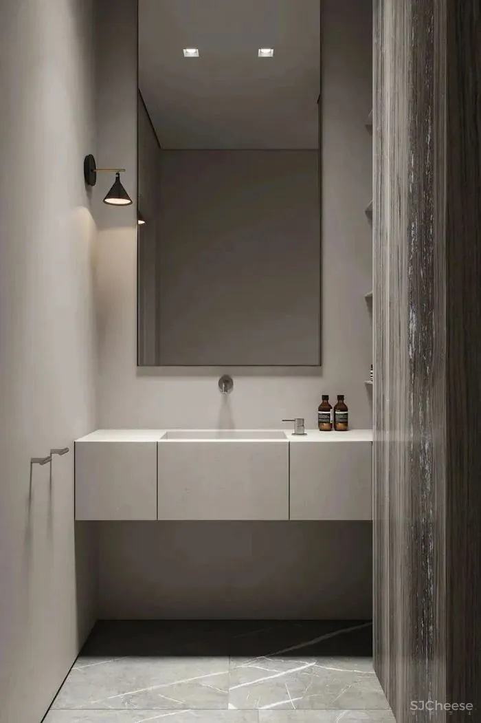浴室延续前面的风格,干净光滑的墙面无需过多的修饰,以保持浴室的干净整洁的效果,通过灯光的烘托,加重氛围感的呈现。