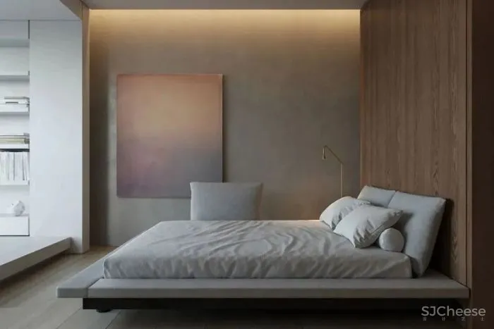 The space of the master bedroom is very empty. There is no soft decoration on the wall. The hidden closet increases the storage function and coordinates with the bed. The slender floor lamp makes the space softer, and the metal texture adds to the texture of the space. A small office area designed by the window is spacious and bright, simple and practical.