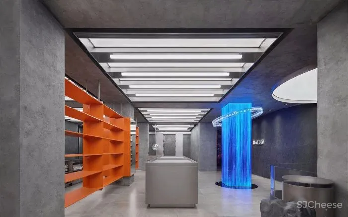 空间氛围将宇宙、天体、时间结合,几何形态贯穿空间结构,用“万物循环”的视角重新释义未来世界。设计风格大道至简,用最简洁的建筑语言和周遭的岭南建筑融为一体,外立面运用了视错觉的设计手法,将每个模块做了斜切处理。