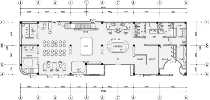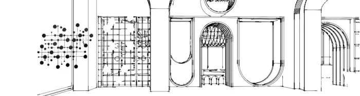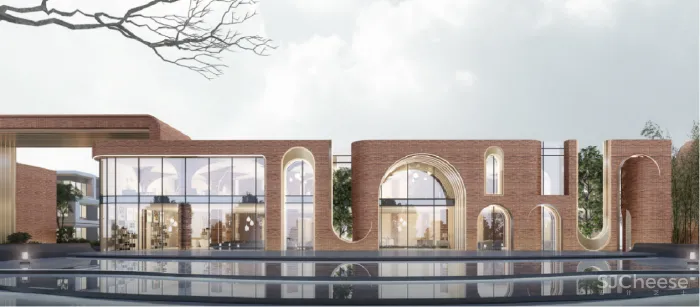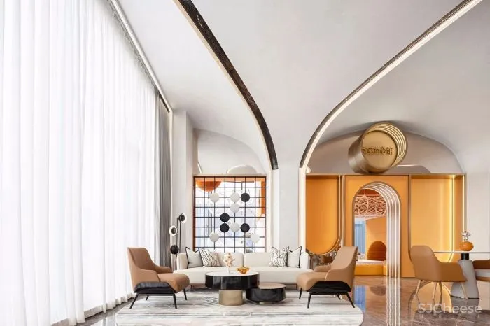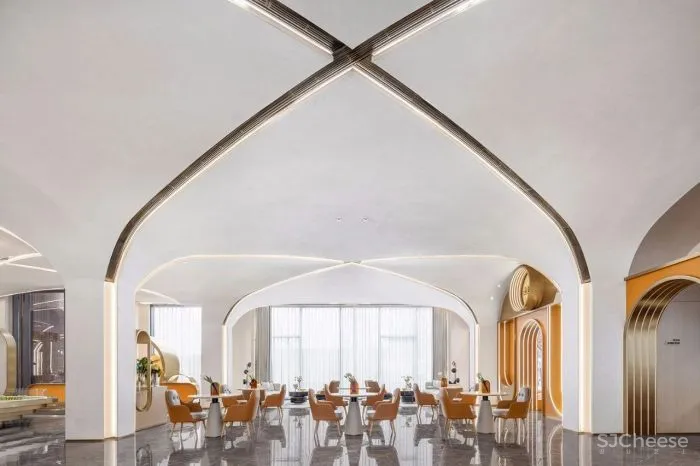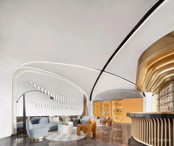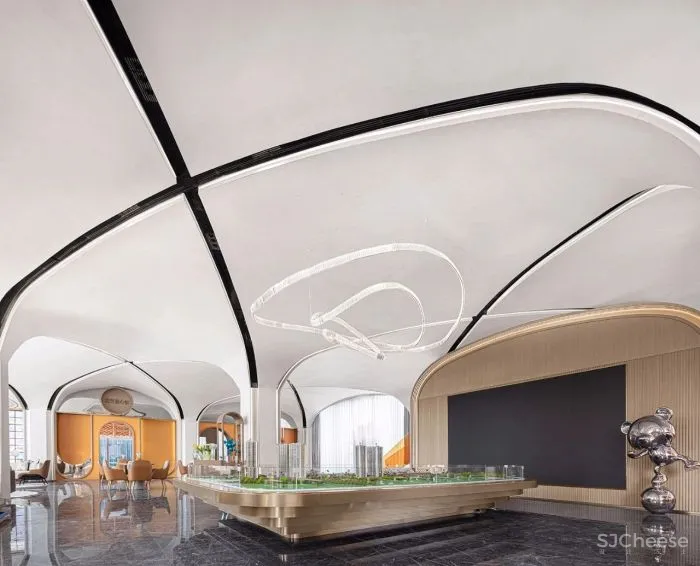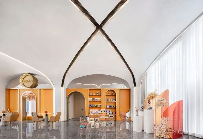 建筑呈拱形曲线的形态。主入口及展示窗口分别以曲线元素体态。整体建筑形态富有时尚感。将建筑的外立面语言拱形曲线微笑元素形态.延用到室内空间,形成室内建筑景观一体化。