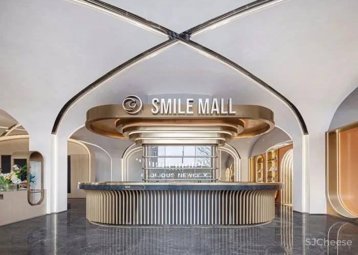 Smile空间及展示部分均分布于微笑符号形成的悬链拱之下,人工形成的光线造型延展了微笑曲线的视觉张力,并增加了空间的商业氛围。灯光的运用更是突出了空间的层次感,成为了空间的雕刻艺术家。
