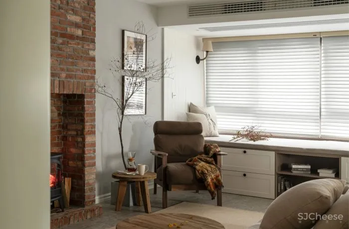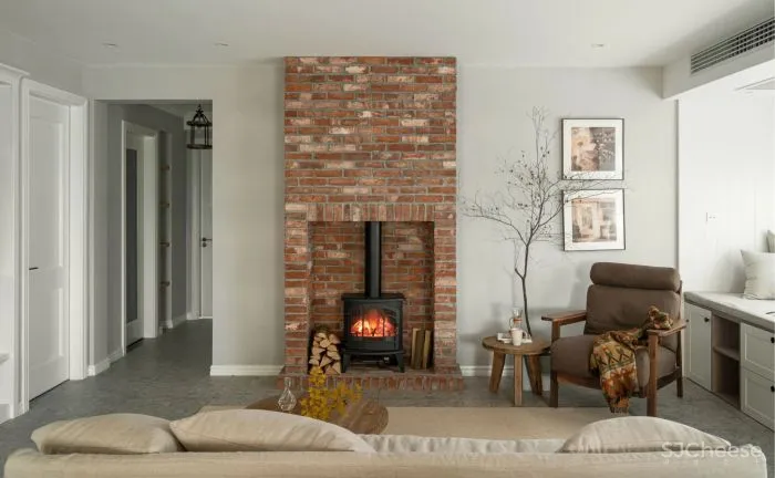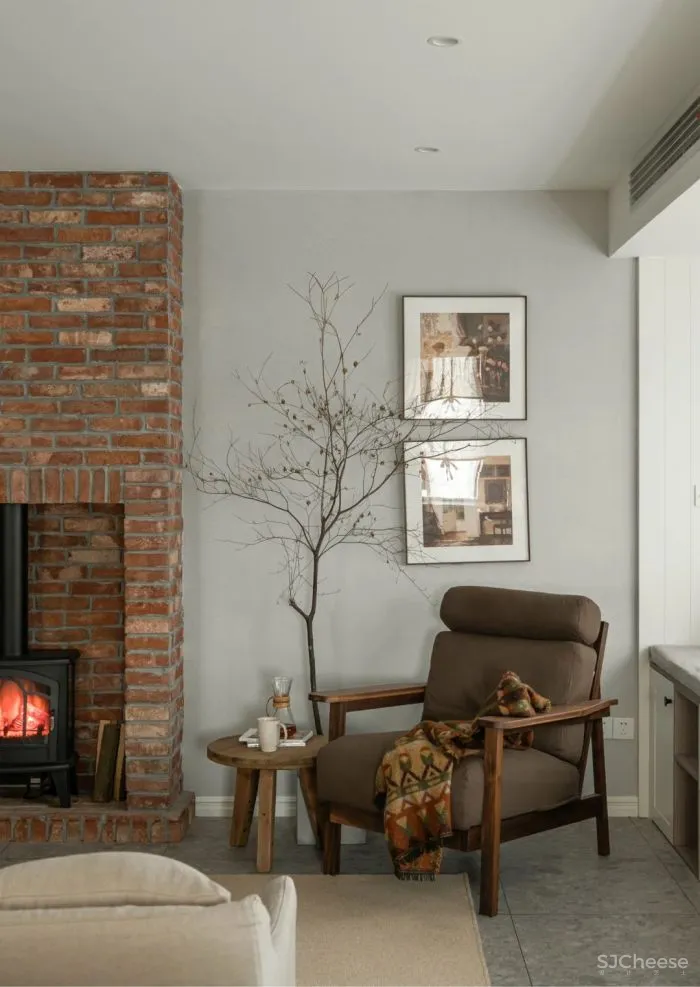 既然是乡村风,壁炉是必须要有的。 屋主不喜欢那种方正的大壁炉, 刷了许多 ins 图,决定用这种小小的、 带烟囱的电子仿真取暖器。