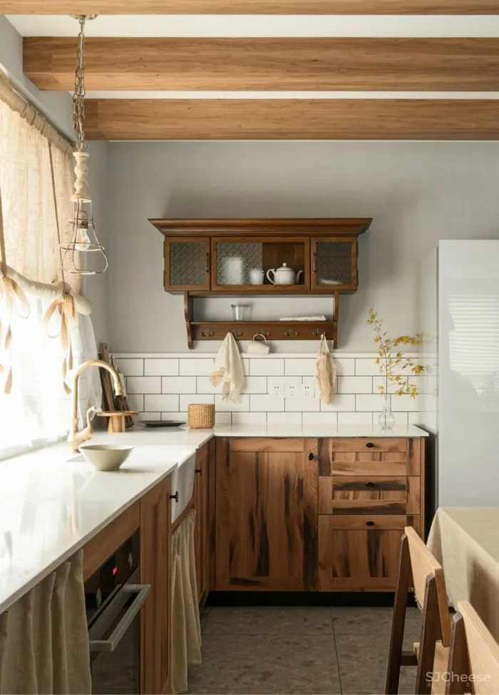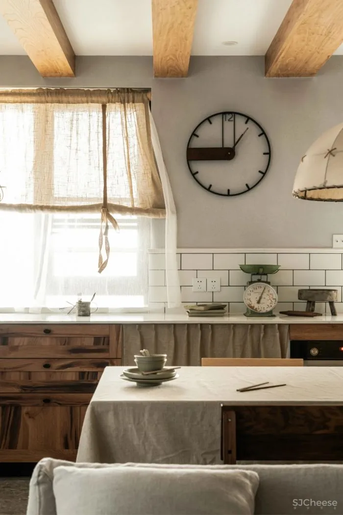 厨房的整体跟细节都是屋主自己设计的, 平时做饭用料理机,没油烟, 就放心在厨房挂上了美丽白色窗帘。