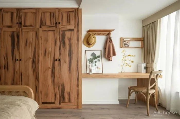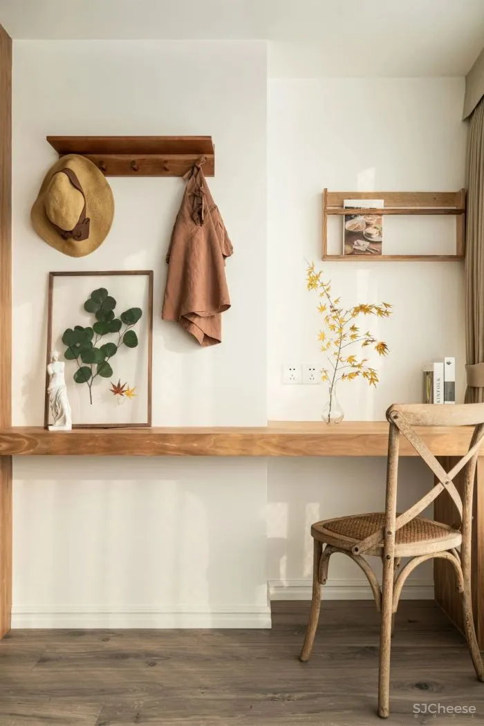 简约的挂钩、壁挂镜与换鞋凳, 统一的原木材质,自带天然的舒适感。