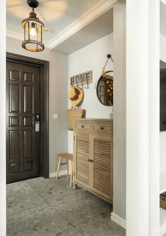 玄关的设计,屋主与设计师纠结了很久, 屋主想做实用的顶天立地柜子, 设计师认为与整体格调不搭, 最后为了颜值,选用了这款轻薄半高鞋柜。