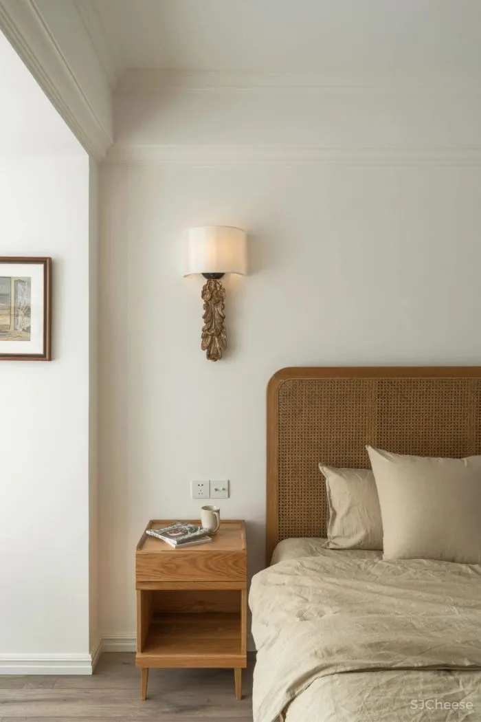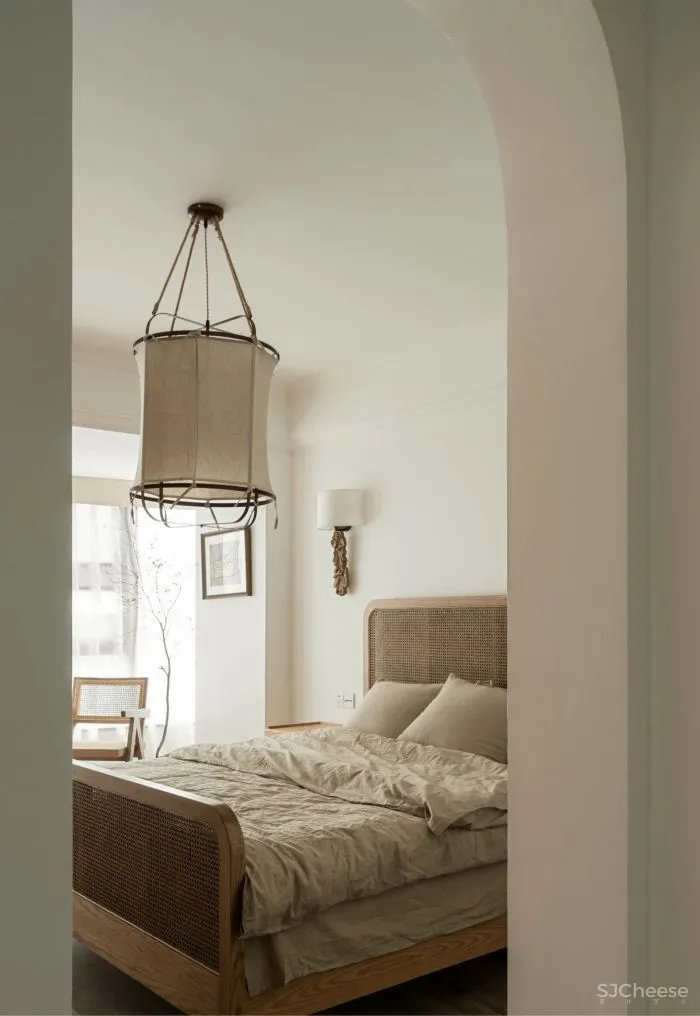 主卧与整体保持一样的基调, 设计师选的藤编床,简约大气, 壁灯与吊灯是屋主看中之后, 经由设计师把关才放心入了,很贴合。