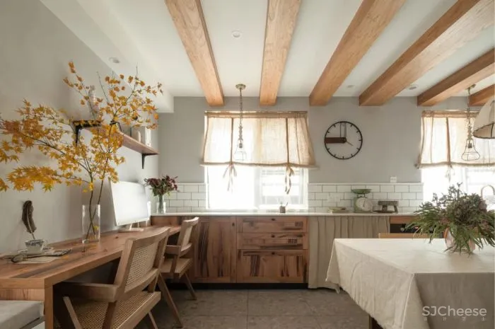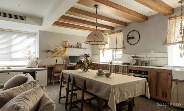 餐桌灯上是承重梁,贴上木饰面隐藏, 两侧干脆做成了一排假梁, 更贴合乡村主题,也实现客餐厅分区。 屋主之前收藏了一些法式的大吊灯, 但设计师觉得过于浮夸, 最终还是采用了设计师的意见。