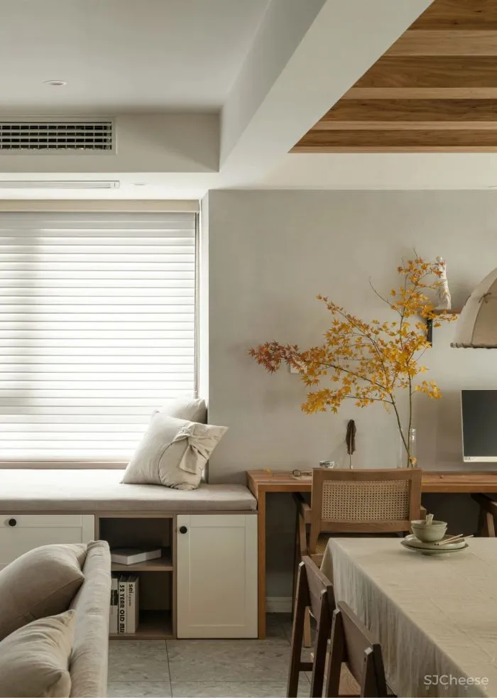 客厅后方就是餐厅, 屋主在餐厅吃饭或办公时, 会看到父女俩在大飘窗上玩闹 那种一家人做什么都在一起的感觉, 令人倍感温馨美好。