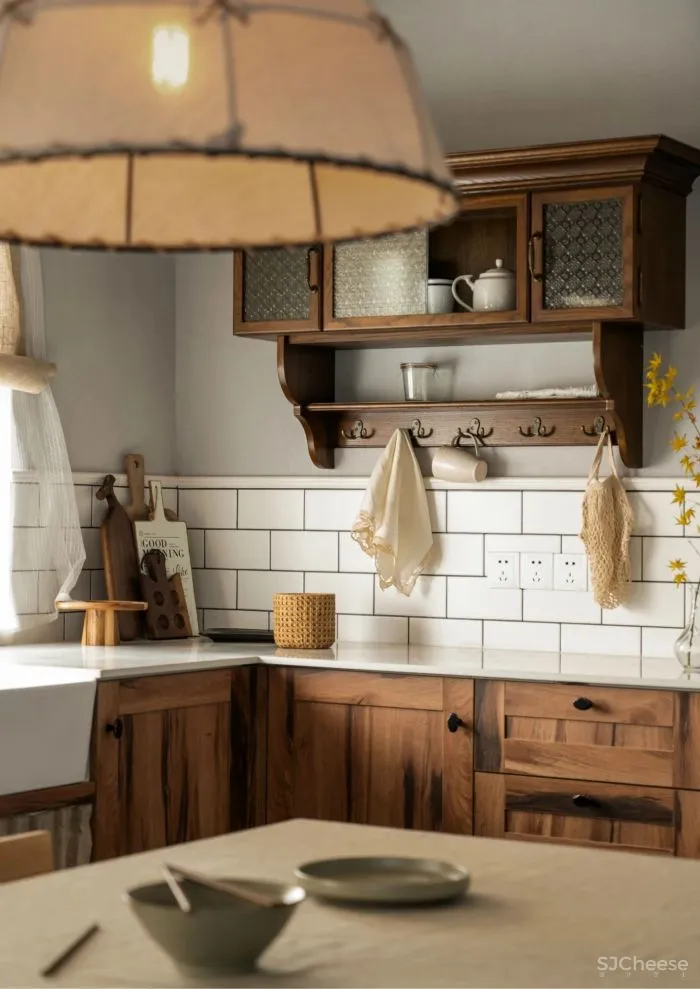 农场前置水槽下方做了棉麻遮尘帘, 地砖选的是灰色水磨石, 搭配一起,也很有乡村气质, 屋主说,看到美美的地砖拖地都开心~ 这个家的选品,在遵循法式基调上, 也有一些简约的现代风格, 整体调性比较克制,看着更舒服自然。