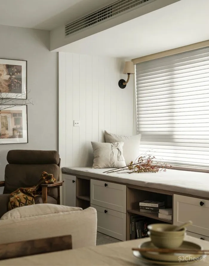 客厅原飘窗长3.8米,又高又窄很鸡肋, 设计师把它加宽到了1.2米, 下方做储物柜,上面可以各种懒人躺, 有客人还能做临时客房。