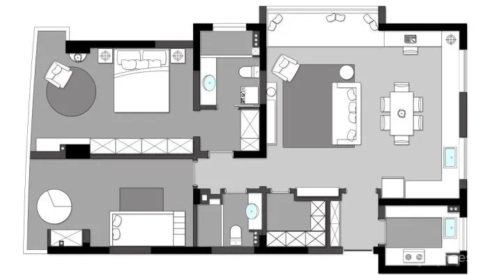 将两个小房间与客餐厅打通后, 多出来的两扇窗也另空间更通透。
