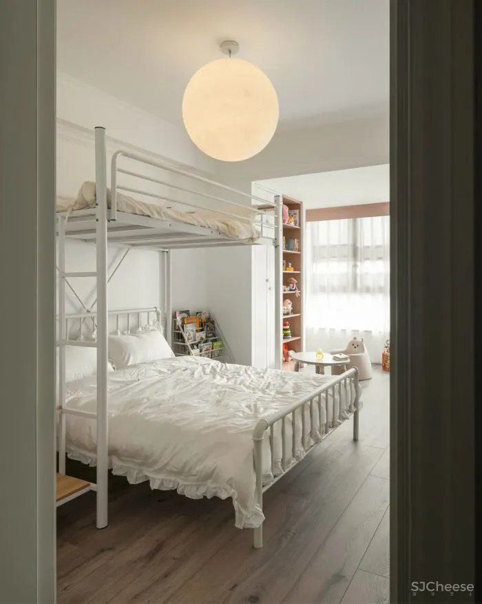 “想摘下月亮送给你”, 设计师选的这款月球灯超美。 男主说希望长辈来时能有个房间睡觉, 于是看了各种子母床、上下铺, 最后原创了这种实用的组合方式, 白色铁艺也属于法式风格。