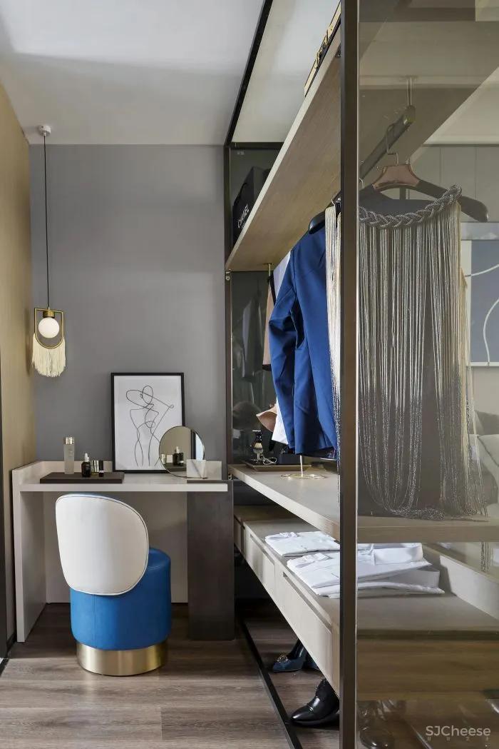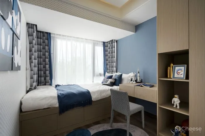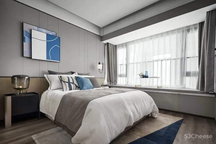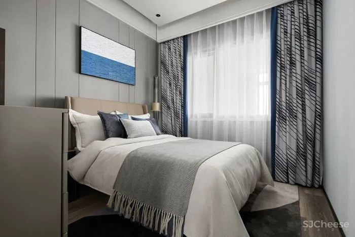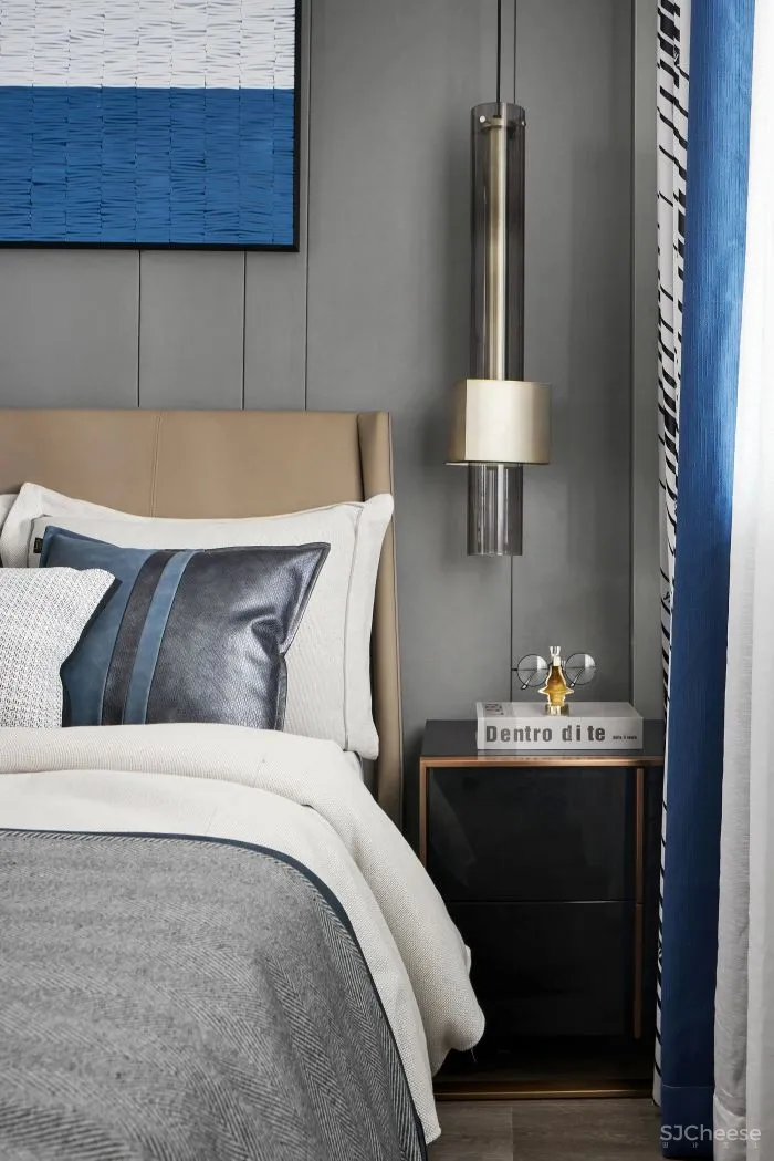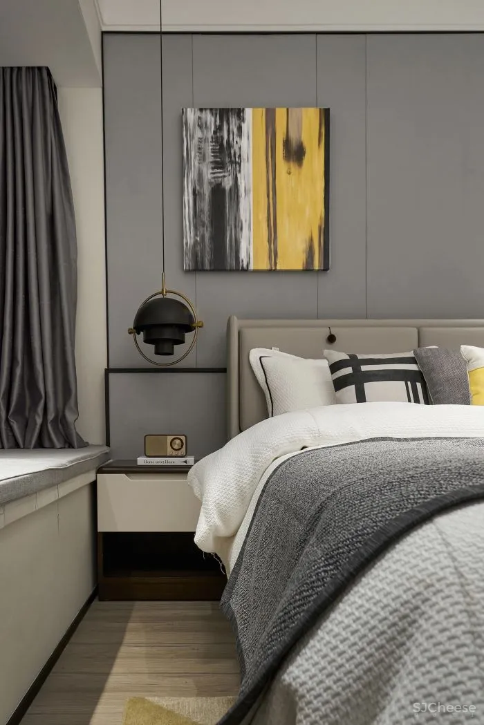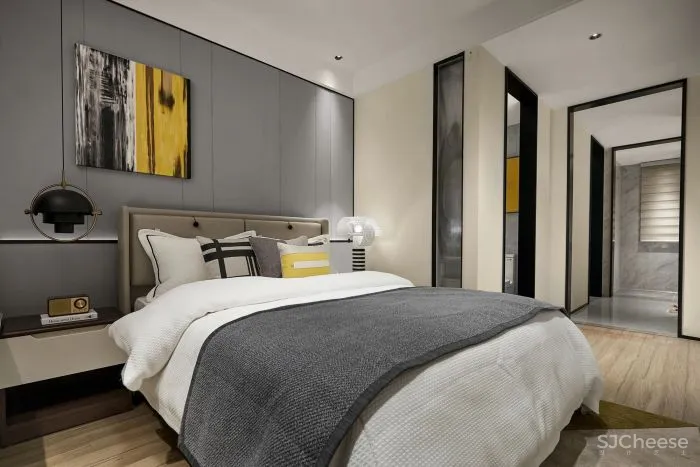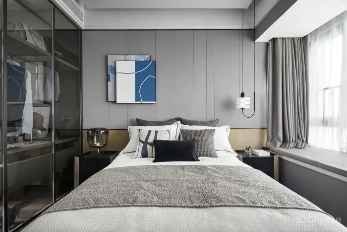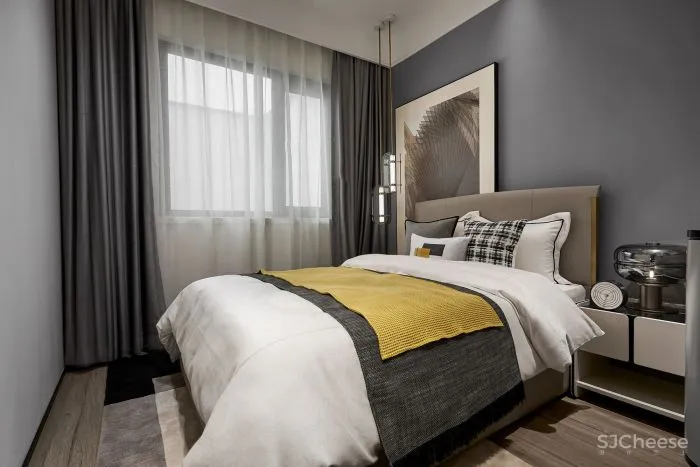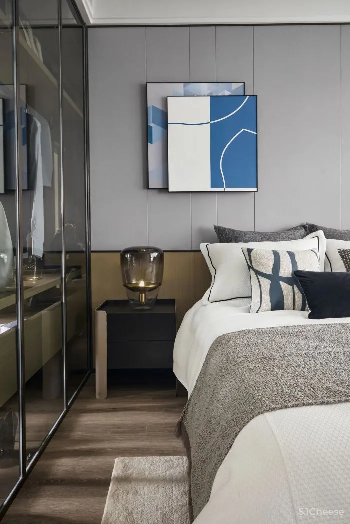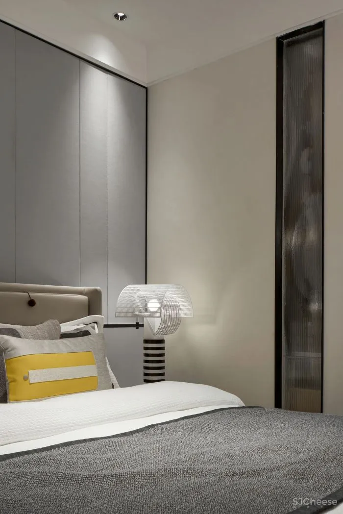 进入卧室,延续客餐厅的空间情绪,从选材到组织营造,我们对细节的把控及配比及对美好生活场景的想象,将这种以色彩及材质肌理为载体的、视觉感官所感知的温暖氛围,蔓延至房间各个角落。