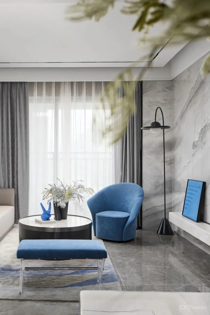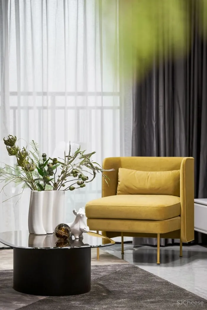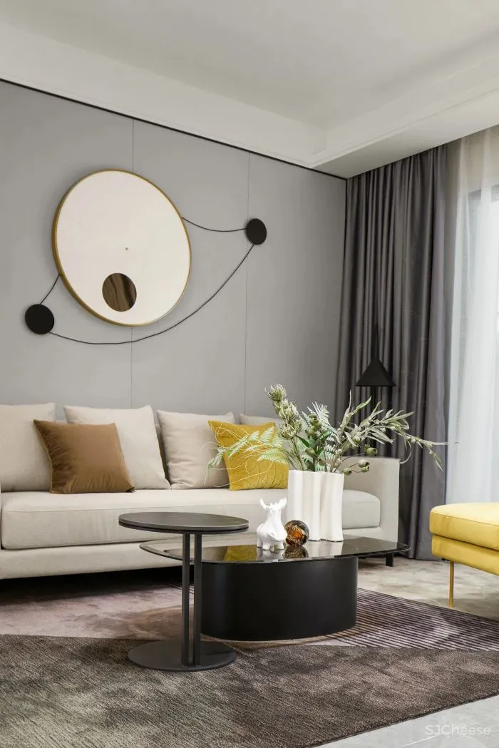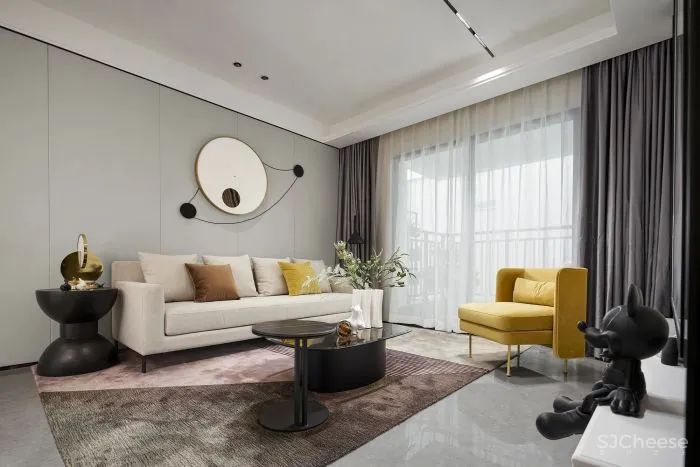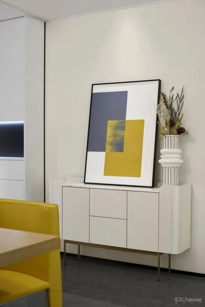 素白、浅灰与柠檬黄的碰撞,棉麻布艺与金属的融合,超大装饰画写意性的搭配,设计以不同材质与颜色的对话,令空间焕发崭新的活力。