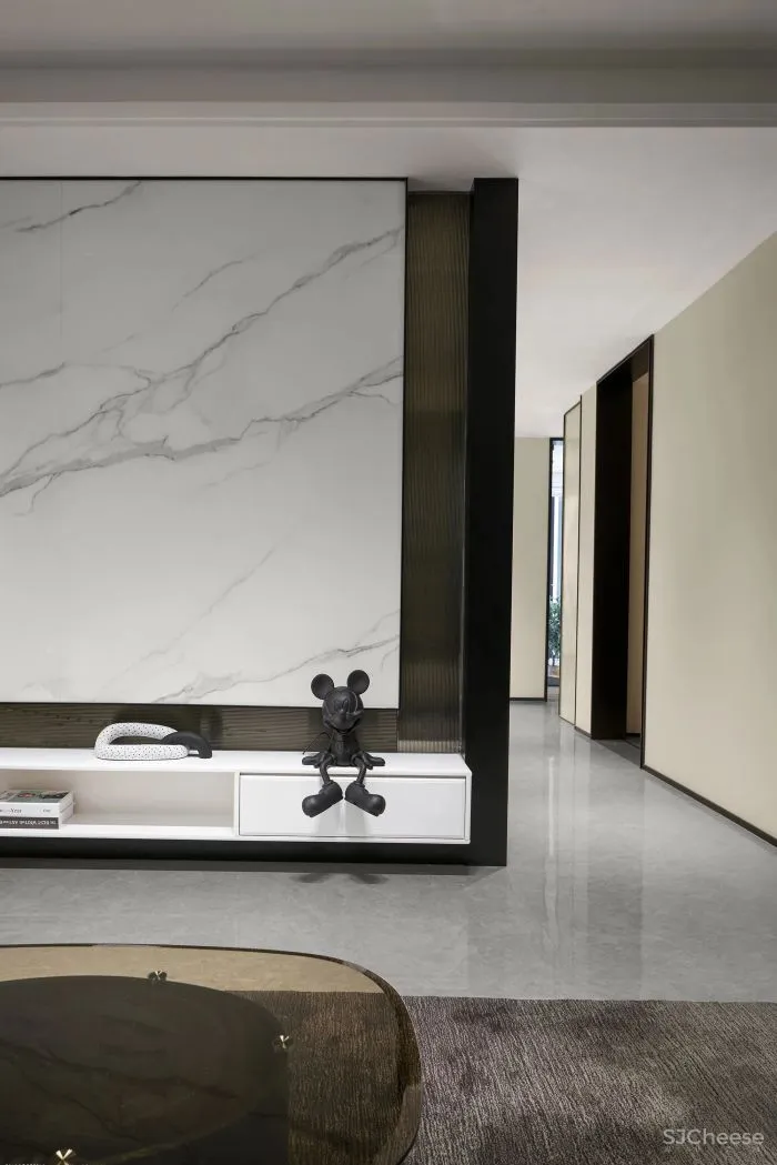 在客厅空间,浅灰质感石材和咖调家具营造现代感,一抹明媚的黄率先闯入眼帘,融入简约几何图形的软装饰品,充满童趣的玩偶形制摆件,点缀生活写意的绿植。时光正好,从初始运用在光影层次的打造,艺术与空间交织出新的篇章。
