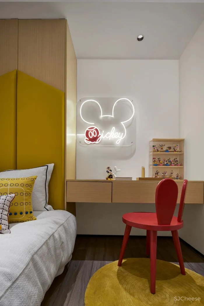 迪士尼与乐高都是儿童的梦想,为孩子打造一个梦幻天地。创意的米奇壁灯与特制的米奇座椅交相呼应,仿佛在聆听这世间美好。孩子的童心是最珍贵的东西,值得被用心呵护。