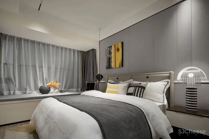 将飘窗空间巧妙利用,当居住者游走于室内,就像置身于一幅充斥着情绪线条的画作内,在理性构建的纯粹美学意境中漫步。