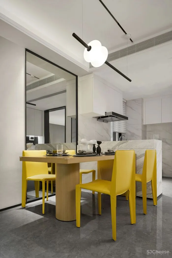 在低饱和度灰调的铺叙下,设计采取亮丽的柠檬黄作为点缀,勾勒着简约灵动的空间氛围。墙面的抽象拼贴挂画,搭配极具艺术格调的装饰小品、特别优选的柠檬黄座椅、开放式的厨房、能扩宽空间的超大镜面……空间呈现出和谐统一的当代美学秩序。