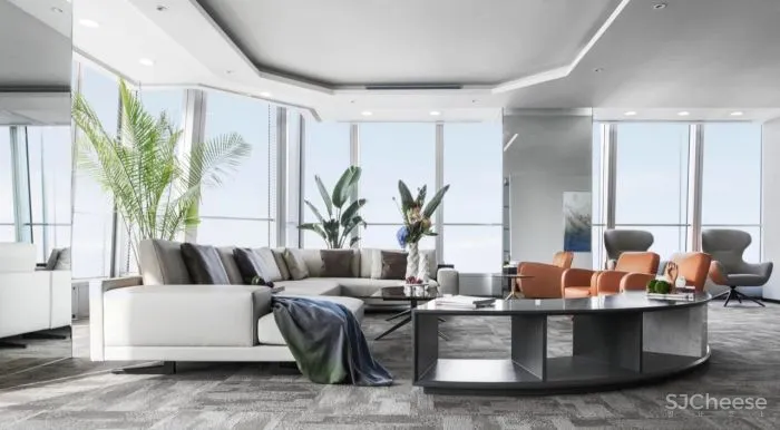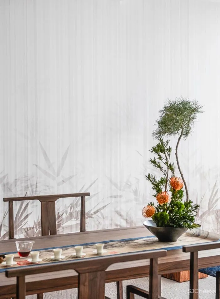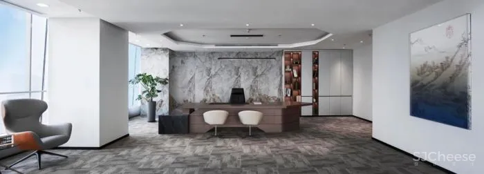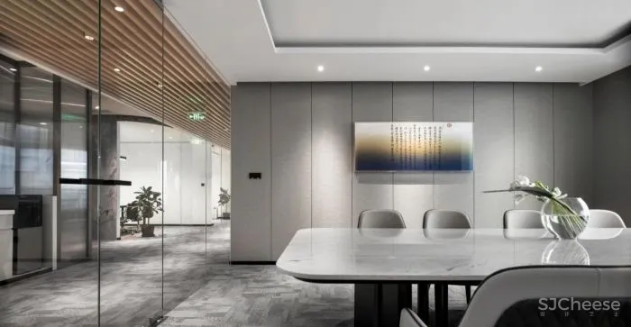 跟随山石纹理的曲面墙可以单独直达会客区和董事长办公室,两个区域共同占据北侧视野最开阔的120㎡。会议室与董事长办公室连通,而茶室与会议室作为公共活动区与茶水区相对而设,玻璃幕墙将其景观纳入到同一个更大的视野当中。