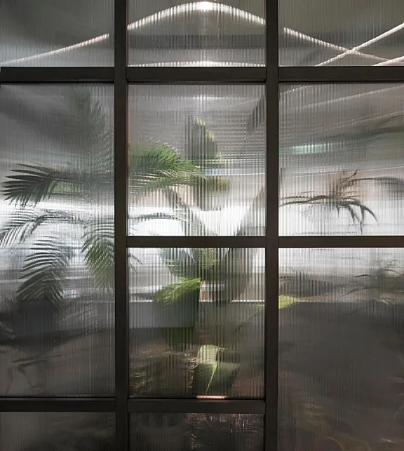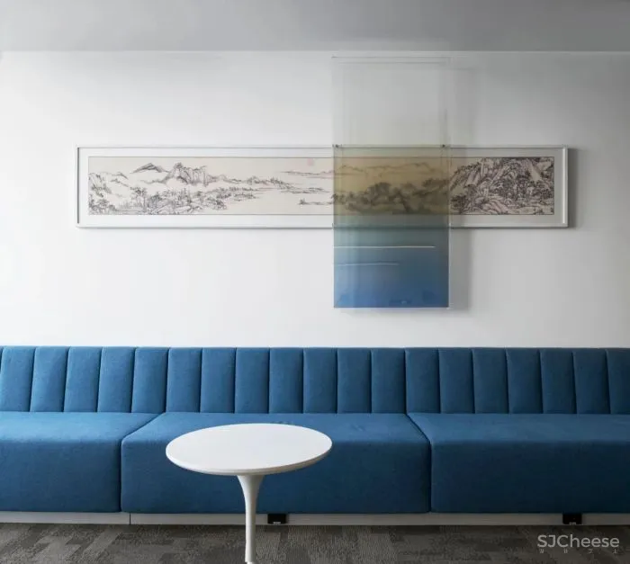 在格式塔心理学逻辑中有这样的解析——当我们看到事物的多组信息时,会自动识别并分别设想每组信息的完整形象,使具有深度的物件的各个方向被压缩,形成浅空间,比如立体主义绘画的诞生。这种叠加则像是浅空间的反向延展,在时间和空间的维度上打开了三维想象。在办公空间中,它以这种张力传达出突破边界却又合而为一的理念。