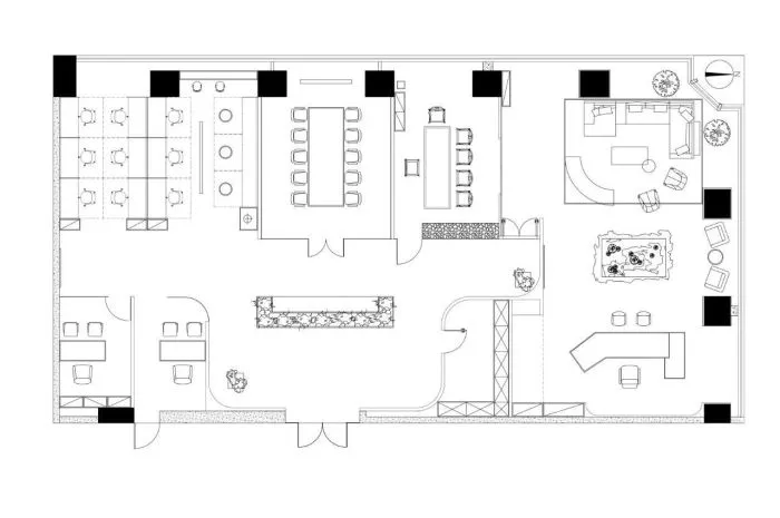 自然肌理转化成材质纹理与印花,通过石材、肌理布以及小型景观呈现。这些趋向自然野生的设计插入空间,亦不去做东西方的明确指向,既有曲面和平面铺陈的大写意趣,也有见微知著的草木山石,在同一空间里形成疏阔愉悦的办公生态,提供一个更有益于创意发生的高效工作场所。