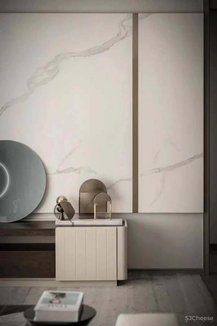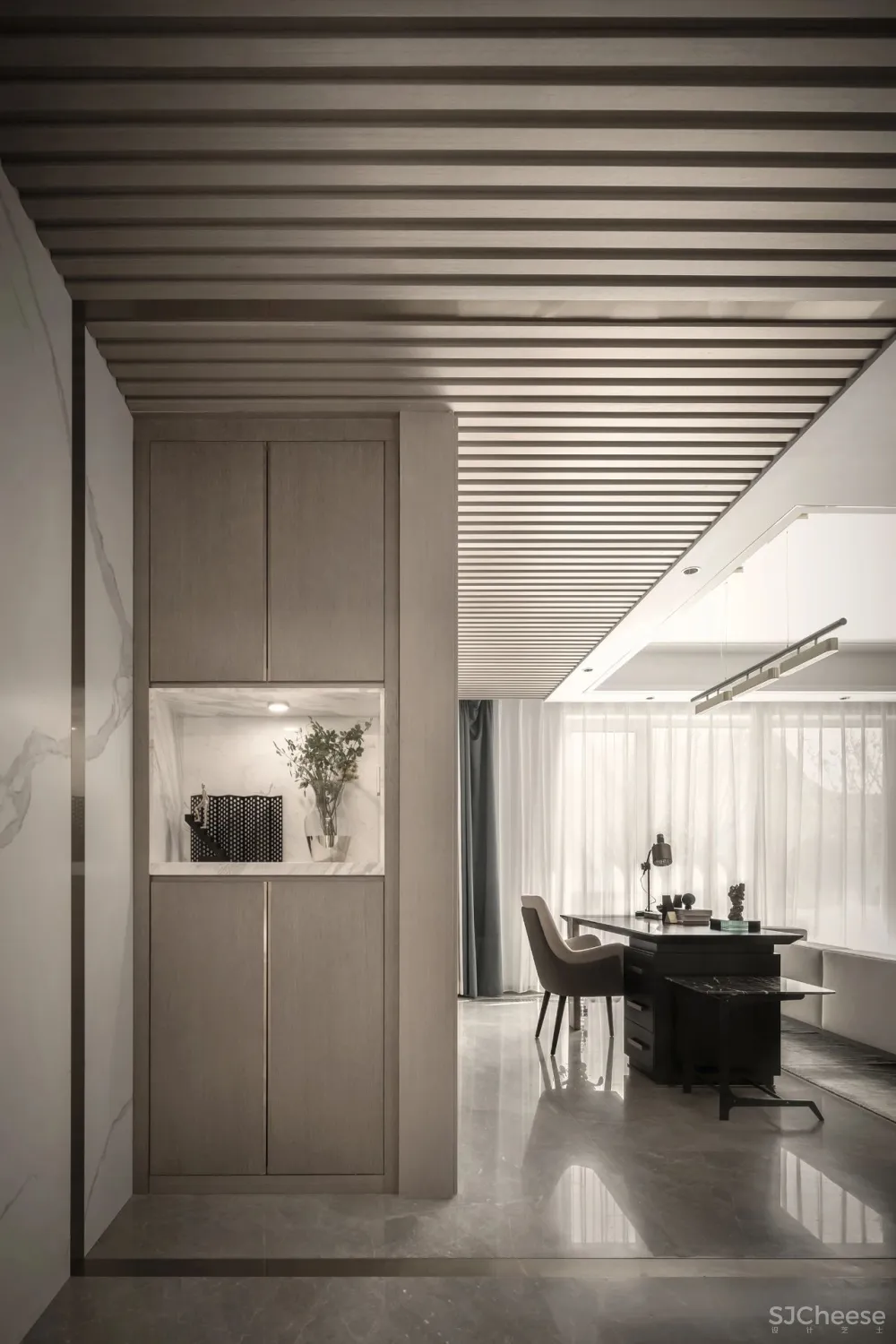 随独立入户门厅步入空间,水墨纹大理石绘出天地明暗对比,仿若置身“占断人间潇洒地”的古典意境中,又恍如当代艺术的时尚前卫。