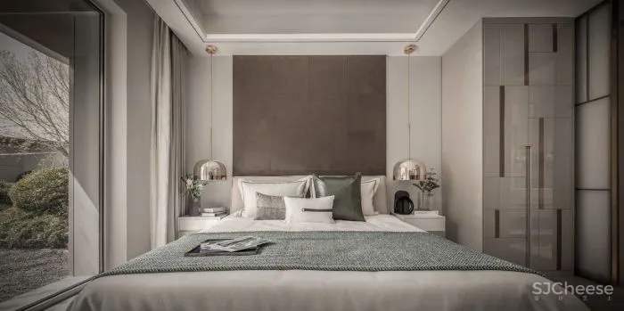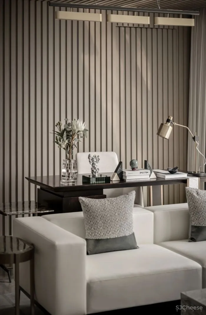 米色、白色、棕灰,层层剥开,奠定了私密空间的纯粹主调,视觉感受也更进一步柔软下来。材质奢华内敛,刚与柔、冷与暖,对比与平衡中,拿捏人居最舒适的状态。