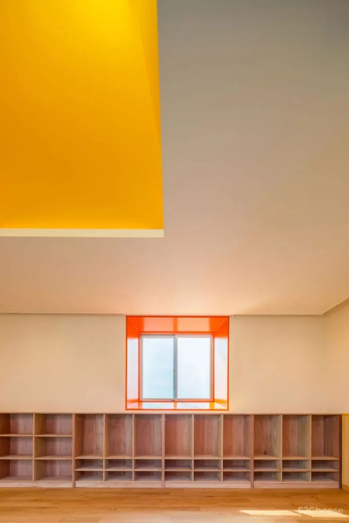 房间内部是五彩缤纷的天地,希望能让孩子在这里感受到多样性。图书角的设计也很有趣,用书架围成了一个空间。 每个空间即是独立的,也是相通的。