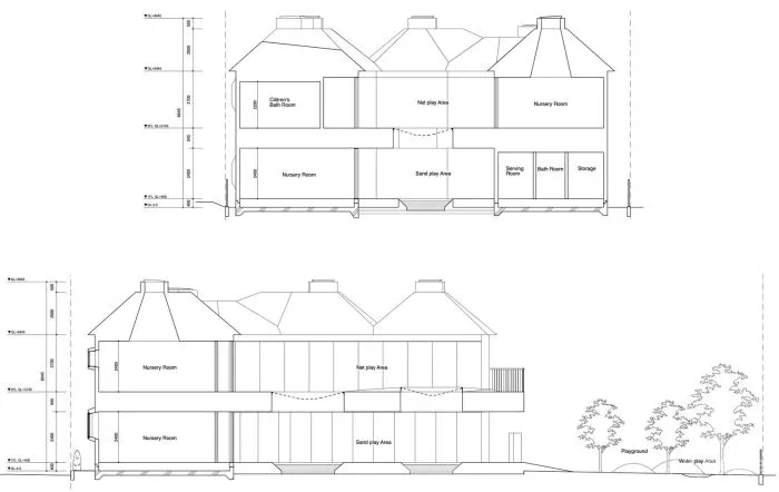 幼儿园一共有两层,二楼设置了两个天井,天井对应的是一楼的游玩沙坑。 二楼房间全部采用玻璃门,保证了采光,随着时间的变化,孩子们可以在不同的房间看到不同的光景变化,也能全方位的监视孩子们的安全情况。