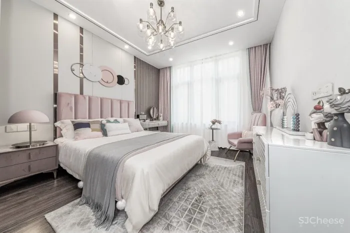 简约的空间在莫兰迪粉的渲染下,充斥着少女梦境中的美好。粉与灰的和谐交融,是少女活泼性格与甜美生活的写照。