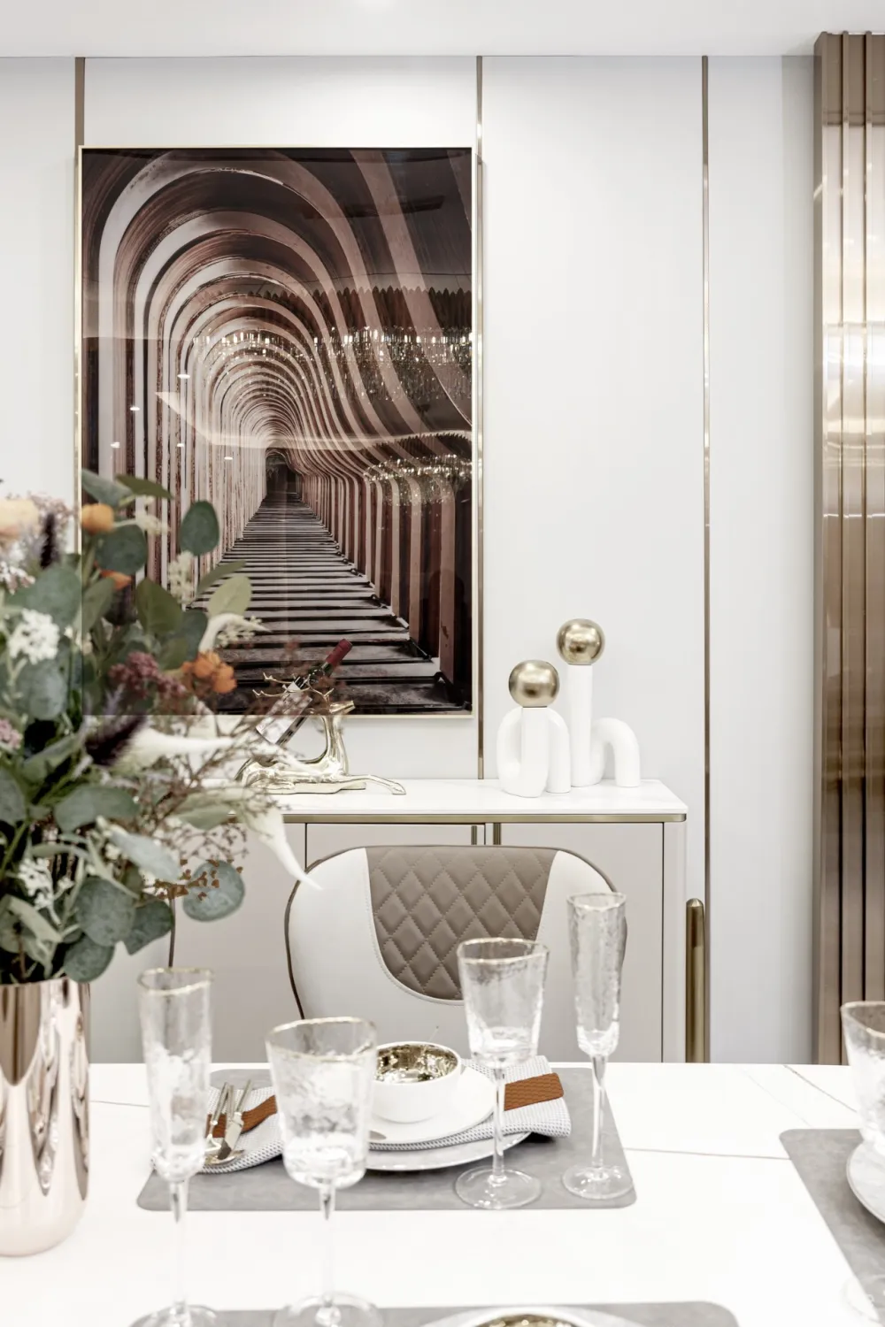 挂画的艺术深邃与绿植的清醒活力相映成趣,偶有几个金属配饰加以点缀,纷纷跳跃于韵致典雅的空间环境中。