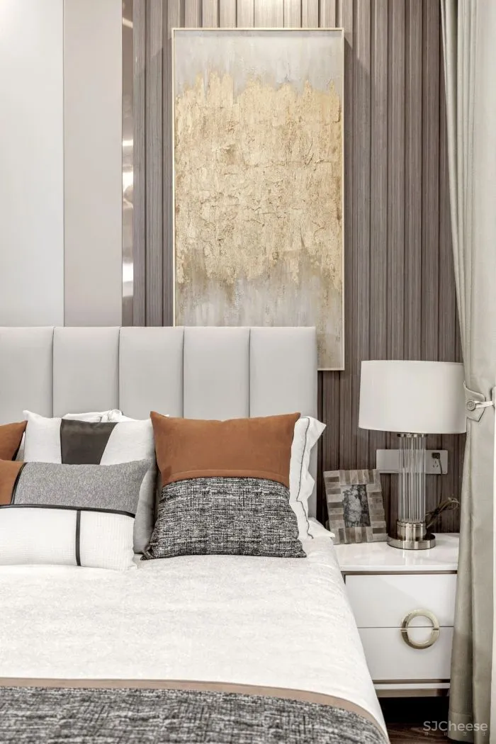 格纹布艺使房间的温馨氛围更加浓厚,几何金属又给房间添加了棱角,二者的融合凸显了主卧的精致高级。