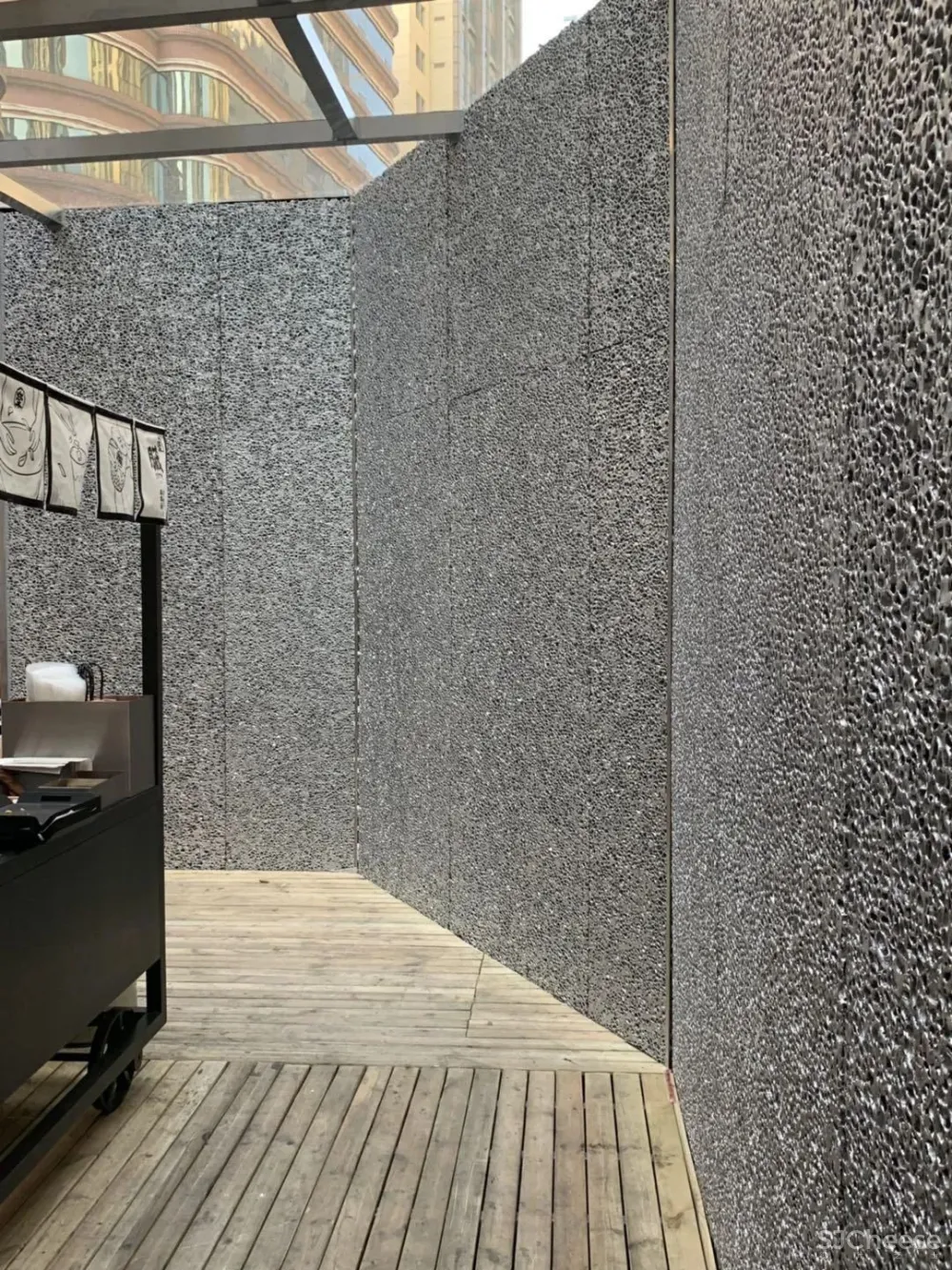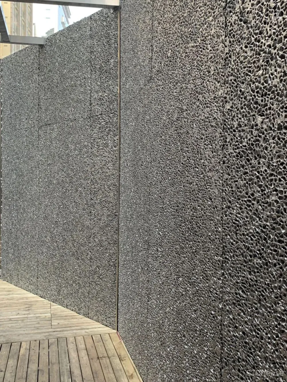 泡沫铝可以通过改变其密度和孔结构来设计所需的综合性能,它具有轻质高强、吸音降噪、防火性能强、抗腐蚀、导热率低、电磁屏蔽性高、易加工安装、肌理优美等特点。