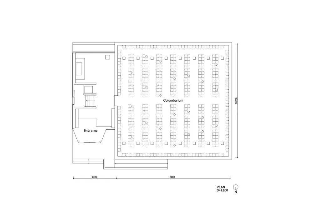 结构 納骨室周围包围着六米高400毫米厚的剪力墙,层层重叠的木栅格窗覆盖其上充当屋顶。剪力墙由钢筋混凝土制成,而且水泥表面暴露在外。