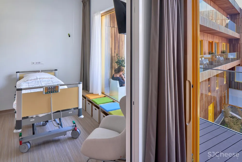 玛西玛公主小儿肿瘤中心的设计核心是以生长为导向的护理,因为即便是生病期间,孩子也仍然在发育。肿瘤中心的布局正是来自于对孩子和家庭的极大关注。没有比让孩子和父母住在一起更好的了:每个孩子的房间旁边都有一个父母的房间。