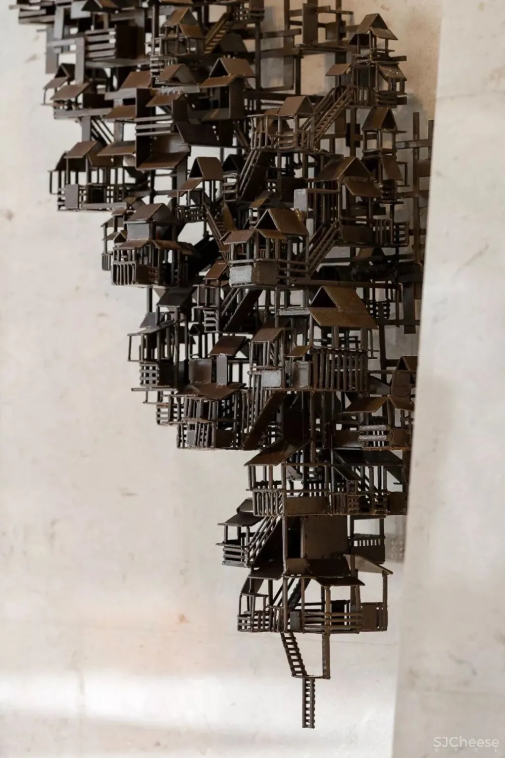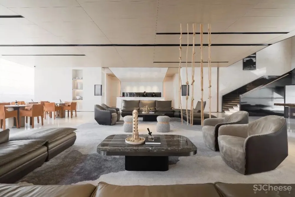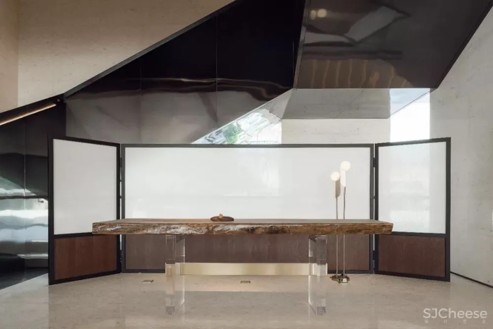 干净硬朗的空间结构,需要有故事的艺术品来点缀。 接待区出现的吊脚楼艺术装置,来自于当代青年艺术家丁浩作品。 几何形态的建筑重叠于此 宜静宜刚 ,展现山城的挺拔健劲之美,在空灵的画面中显得更加通透流畅。
