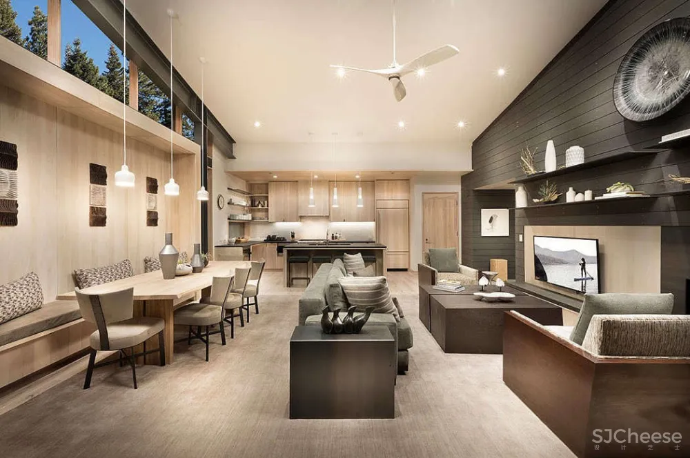 The client came to us for new furnishings, art and accessories to compliment the clean contemporary design of the home. Modern pieces, pillows and cushions in warm vivbrant fabrics, textured wall coverings, and stylish accessories combined with modern technology like the state-of-the-art media room, create a perfectly comfortable space for congregating and relaxing after a day in the mountains.