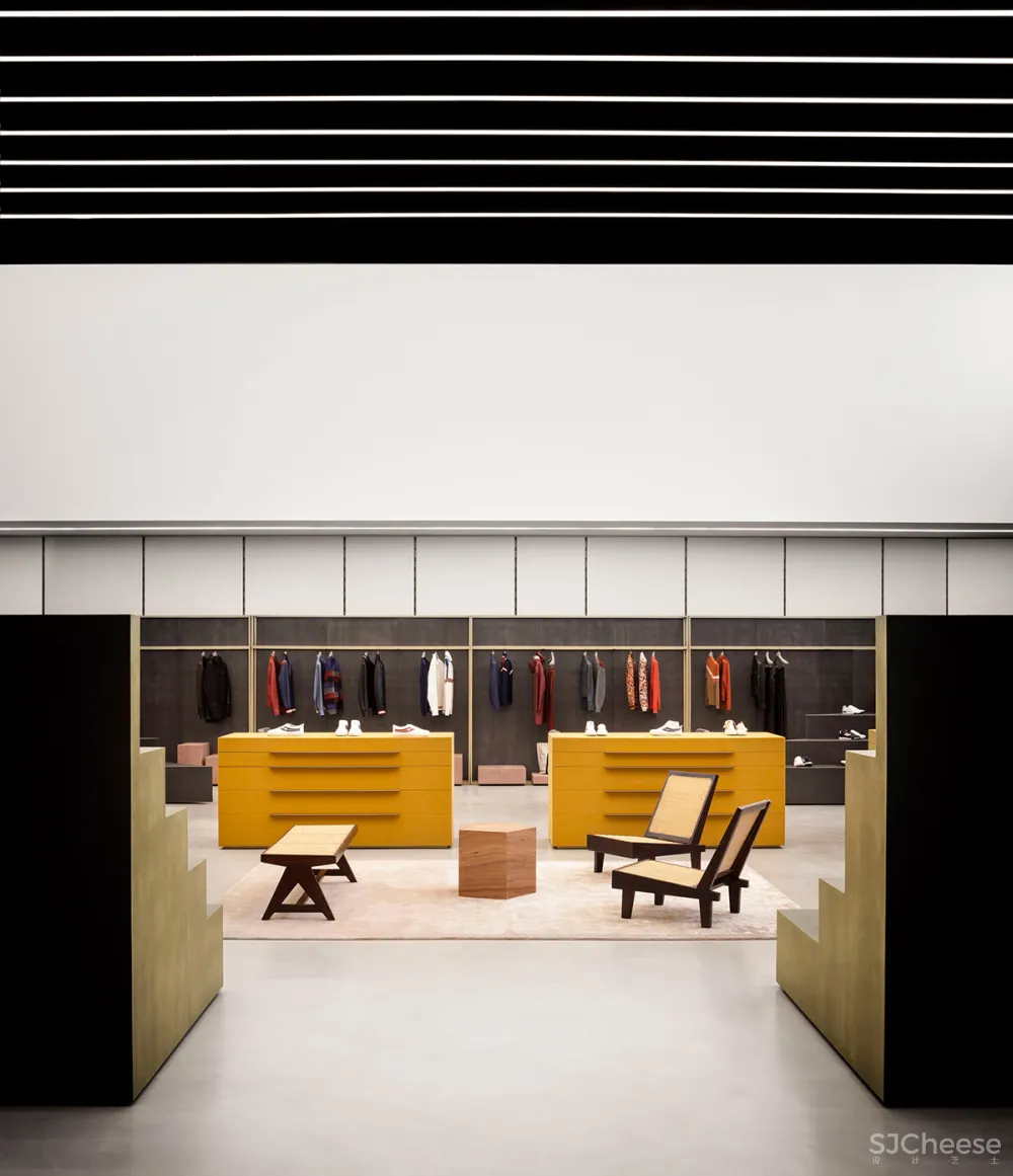 由于衣服悬挂在与周边墙壁相连的细长黄铜栏杆上,房间的中央点缀着大型抽屉柜,装饰有丰富的蛋黄色织物。由法国建筑师JeanProuvé设计的灰色大理石台面和椅子也被用来装饰空间。