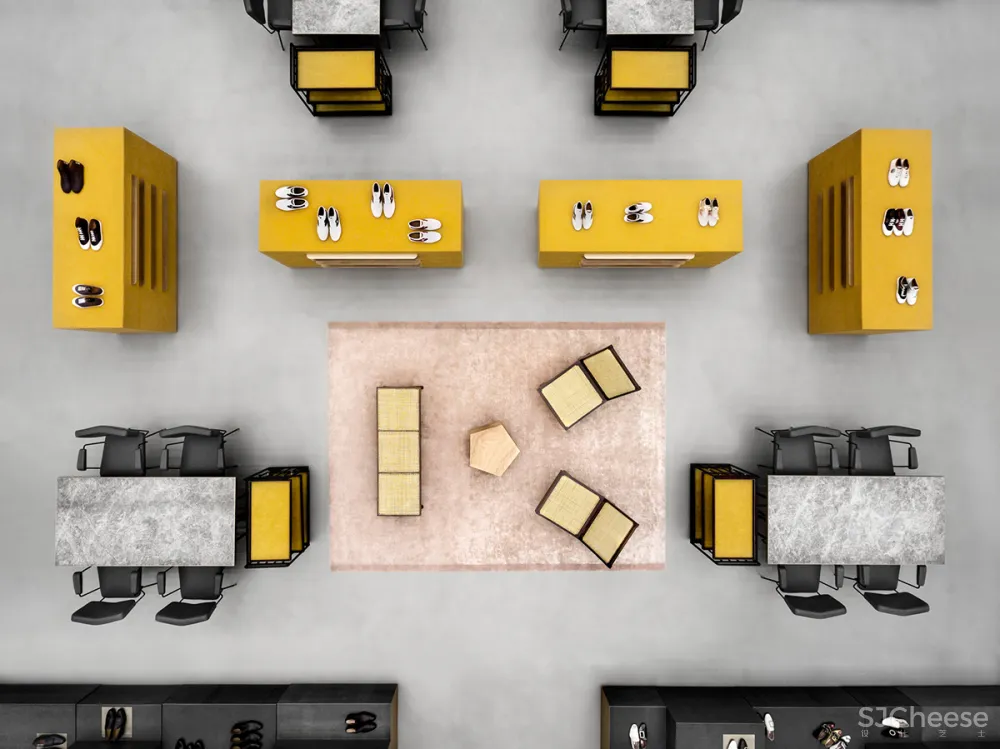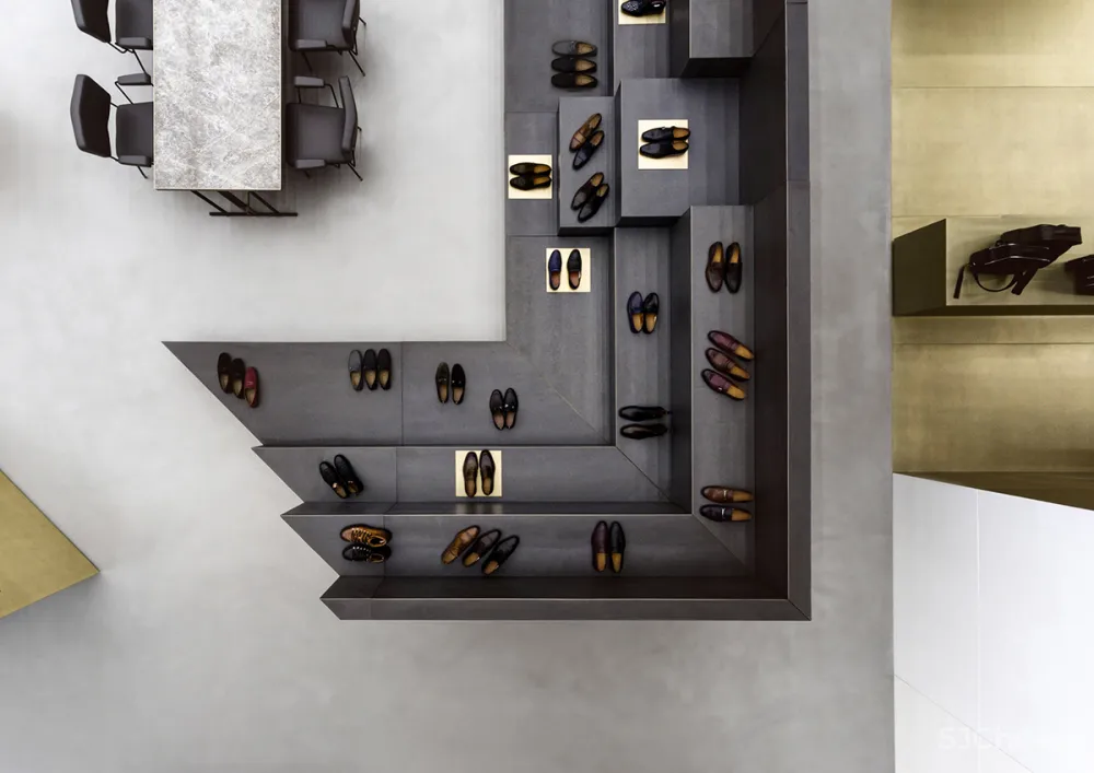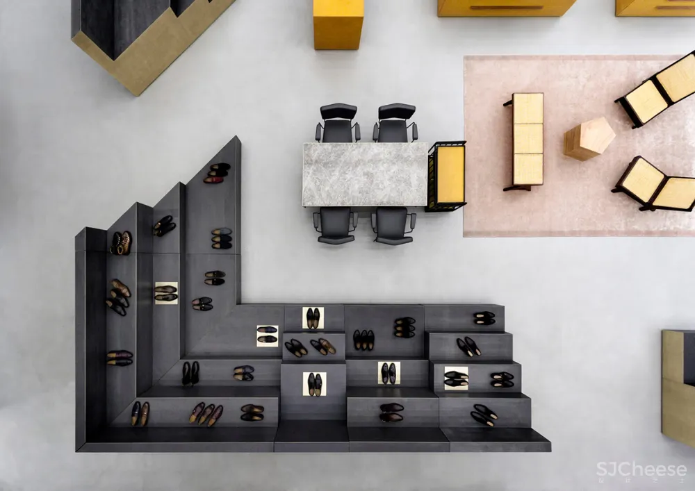在这里,鞋子呈现在阶梯式搁架块上,用于模仿圆形剧场中的座位。由纤维混凝土制成并以轮子为基础,可以移动块来创建不同的显示“场景”。