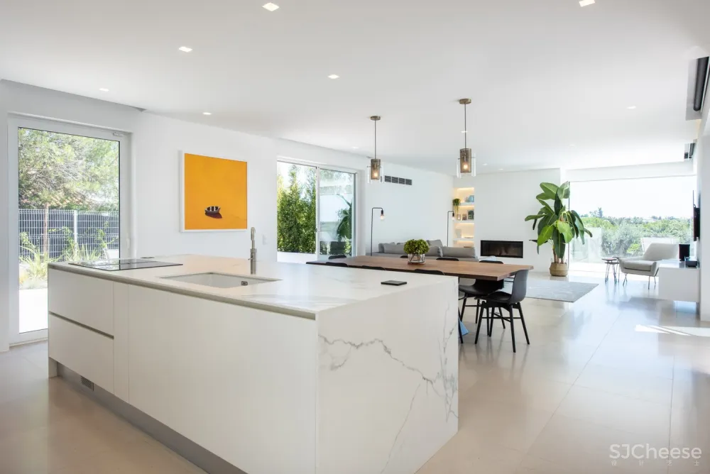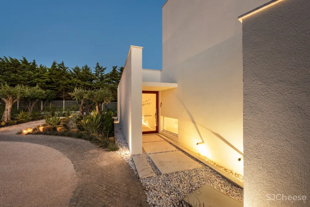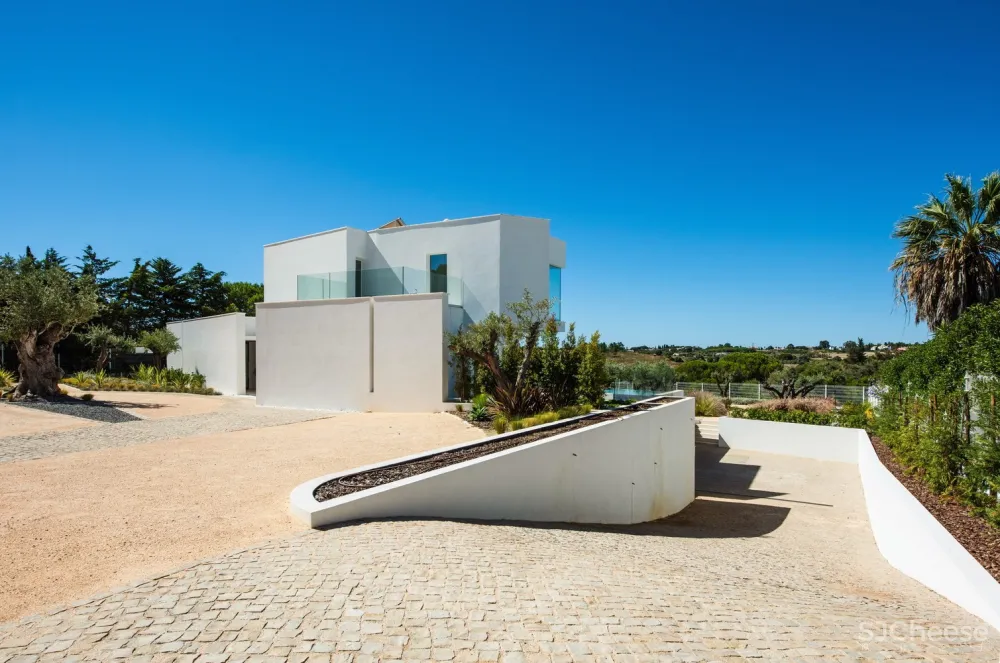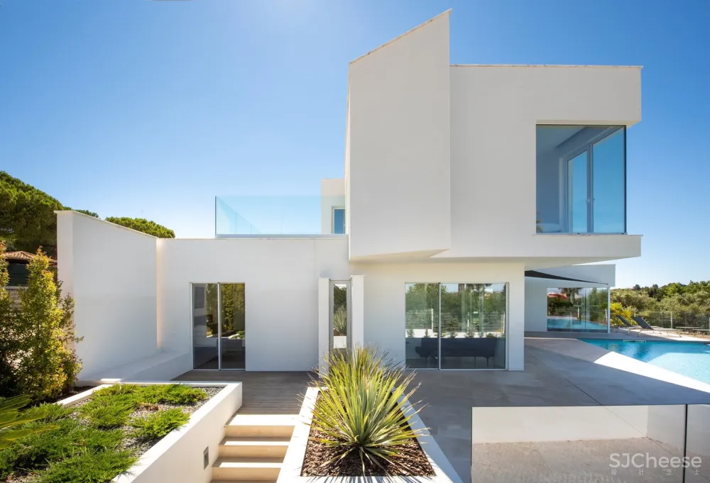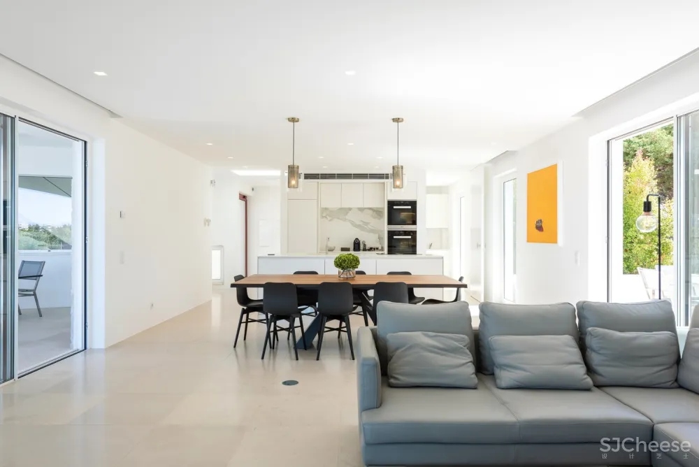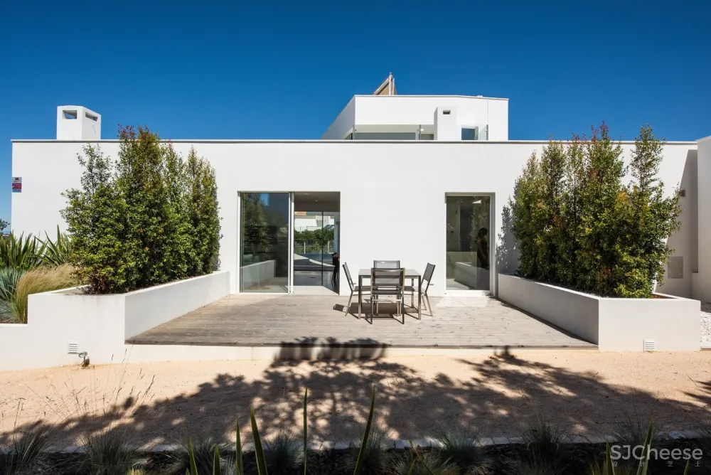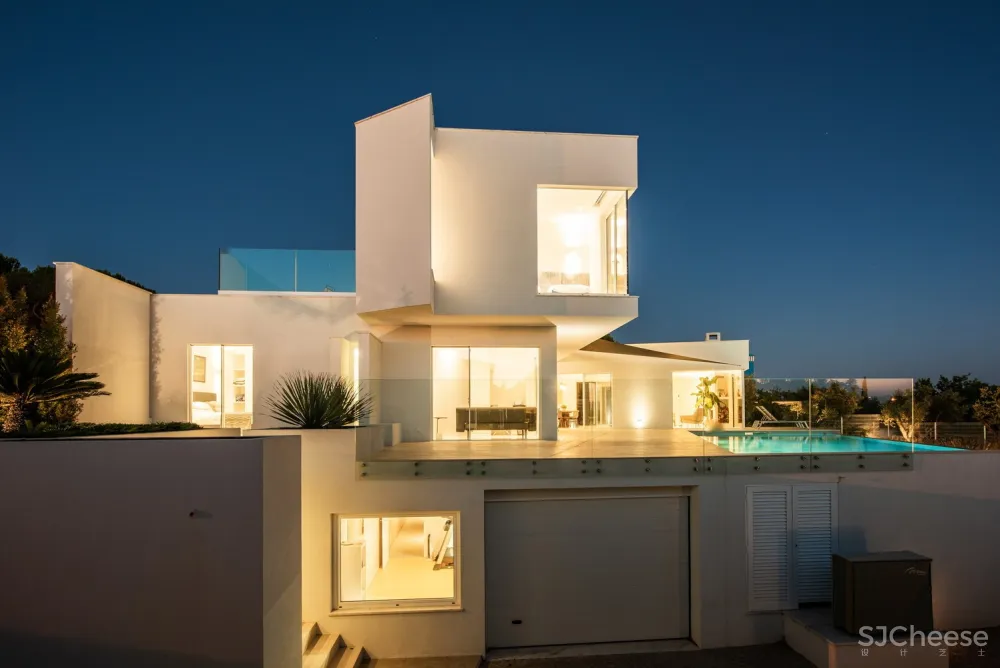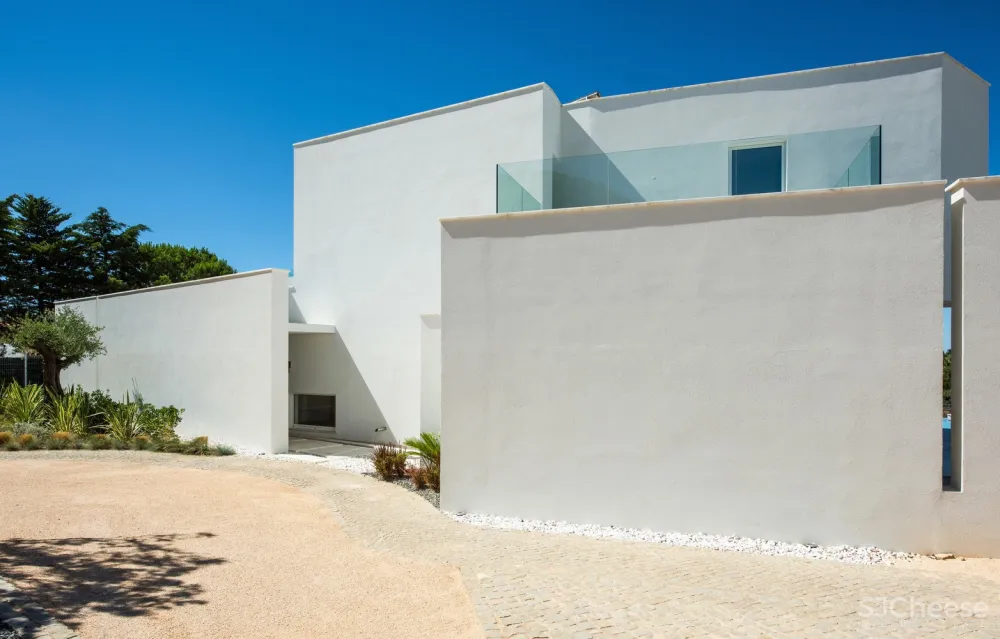 地中海现代主义建筑的真实诠释与葡萄牙立体主义建筑的平衡融合。一个纯粹的白色当代简约主义家庭住宅位于Quinta dos Salicos, Carvoeiro, Algarve(葡萄牙)。基于自然有机的布局设计,建筑的主要形状(梯形)遵循地块本身的形状,在室内外空间(自然融合)不断开放的视觉和物理关系中,引导不同的立面获得最高效、阳光和宜人的景观。