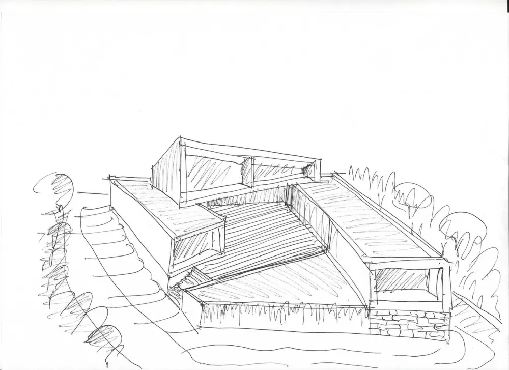 这是“两个世界”之间的分界线。“第一个最不透明和秘密的世界”,在北方(入口),在那里发现了围绕着他们的计划的空间,就像一个迷宫的墙;“第二世界”,动态的,开放的,流体的,与外部区域(露台和游泳池)和它的环绕(花园和自然景观)的交流。