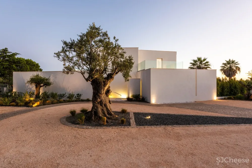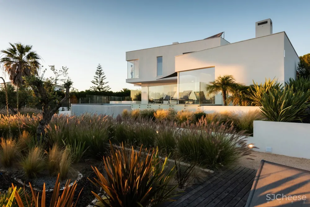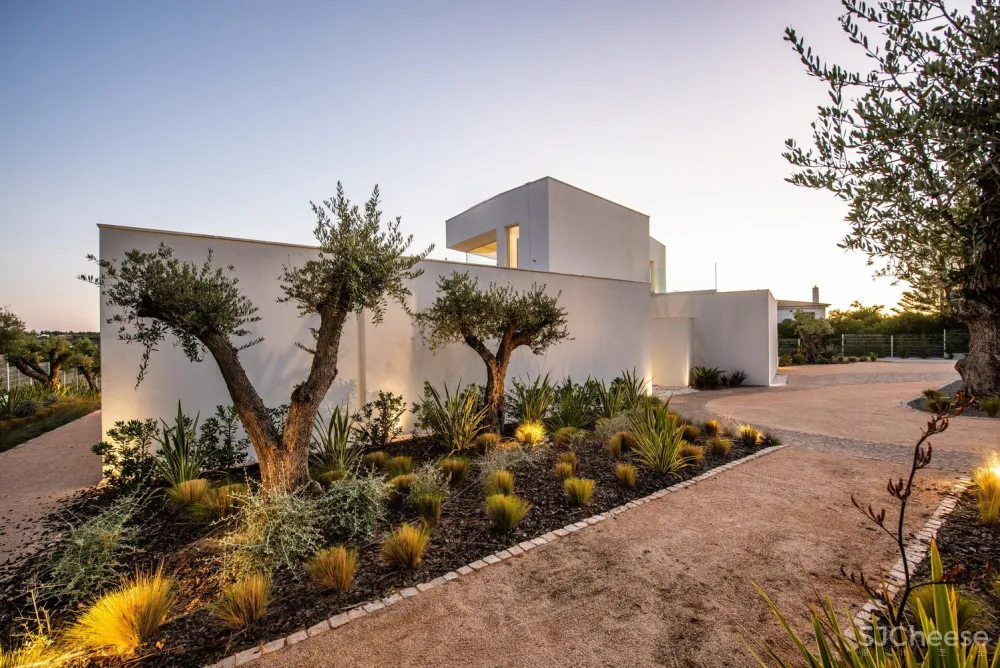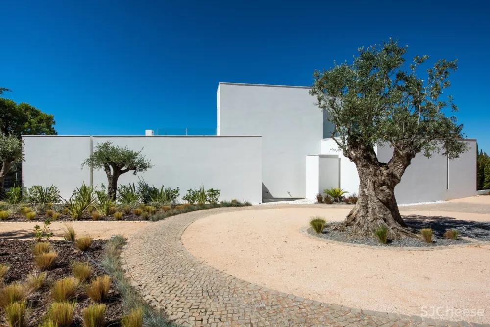 一个减少维护(低耗水量)的有机地中海干花园概念,尊重地块的原始斜坡,低矮的植被被白色的砾石颤音包围,一些橄榄树和果树被松树树皮覆盖。最小的,低维护的概念与葡萄牙的灵感,使用当地的材料也呈现在外部循环和主要入口入口,那里用鹅卵石地板来定义路径。