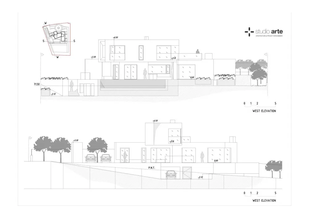 纯粹的直线、统一的颜色(白色)、平顶(生活露台)和由不规则角度塑造的体量,以及由光线/阴影在不规则体量设置上的关系定义的概念。建筑概念遵循生态友好的方法,以优化气候和自然采光/通风条件为基础。