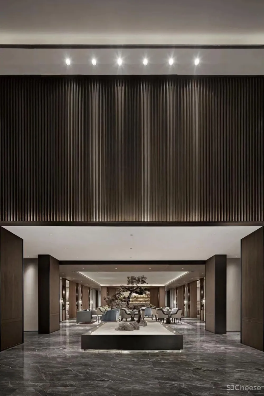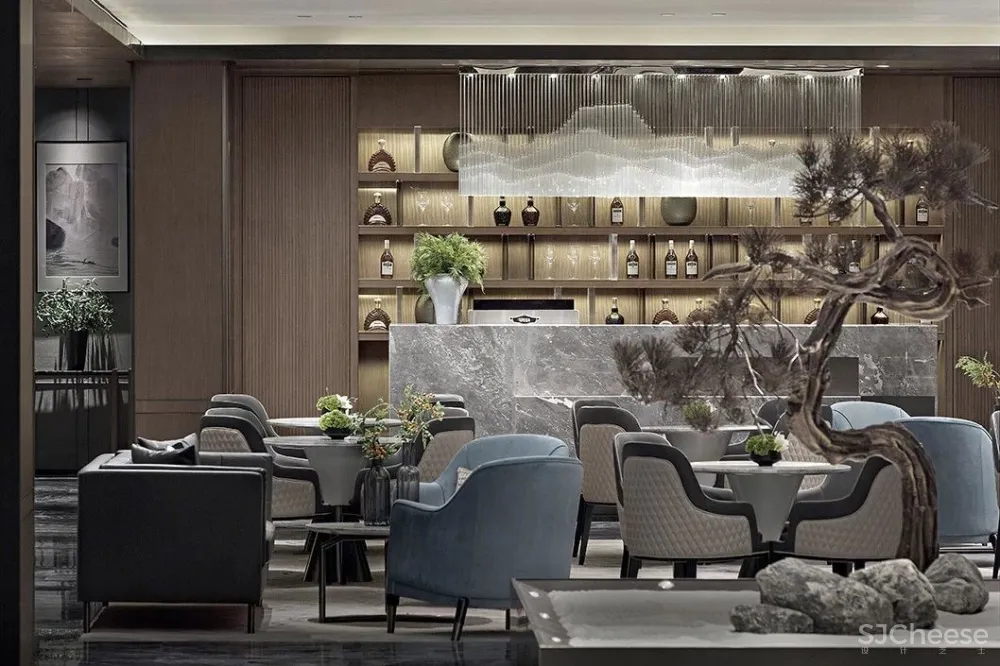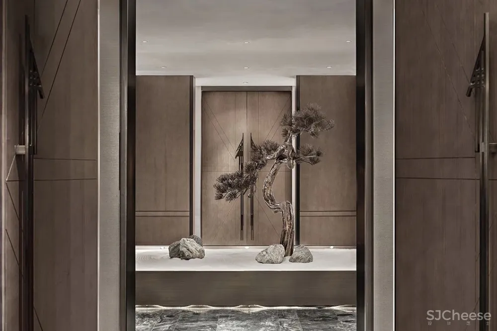 东方禅意的松植,交错的光线,斑驳的竹影,设计师张怀、郑亮、周术荔以光为笔,以意为境,将一切设计语言自然的融进空间中。