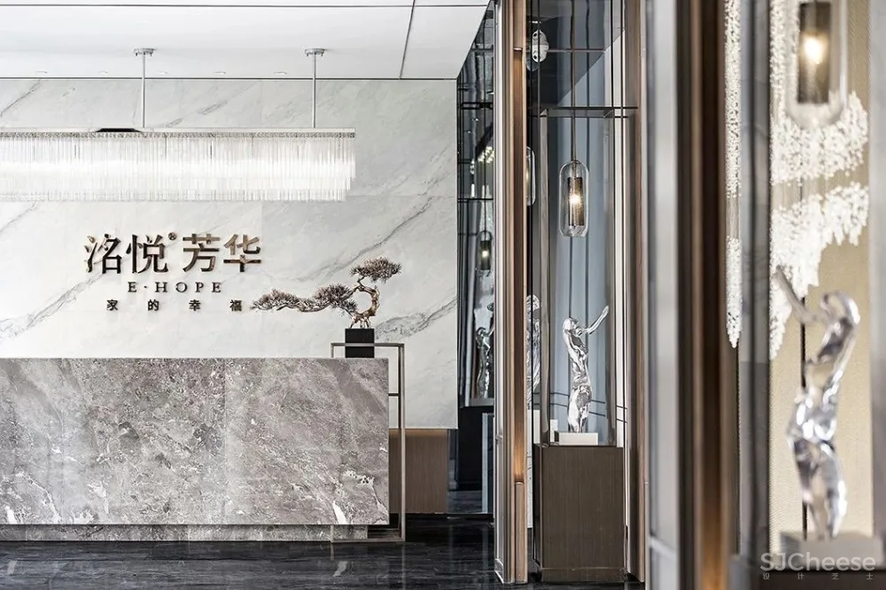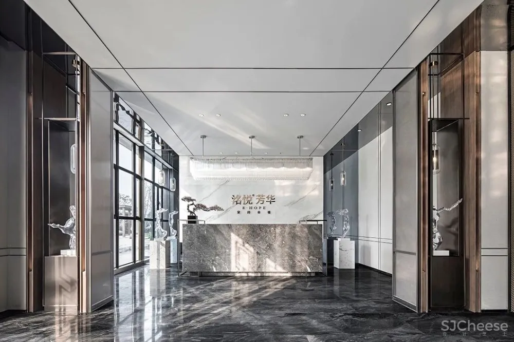 “建筑处于安静和躁动之间,需要去思索韵律和平衡”关于武汉.洺悦芳华销售中心的设计。 三位设计师给出了更多的思考,两侧摆放序列感极强的饰品展架,用剔透的水晶装置点缀其间,整个空间霎时灵动起来。